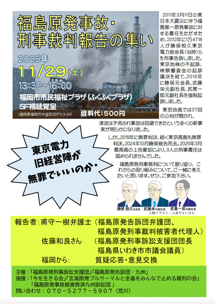 - 主催:「福島原発刑事訴訟支援団」「福島原発告訴団・九州」